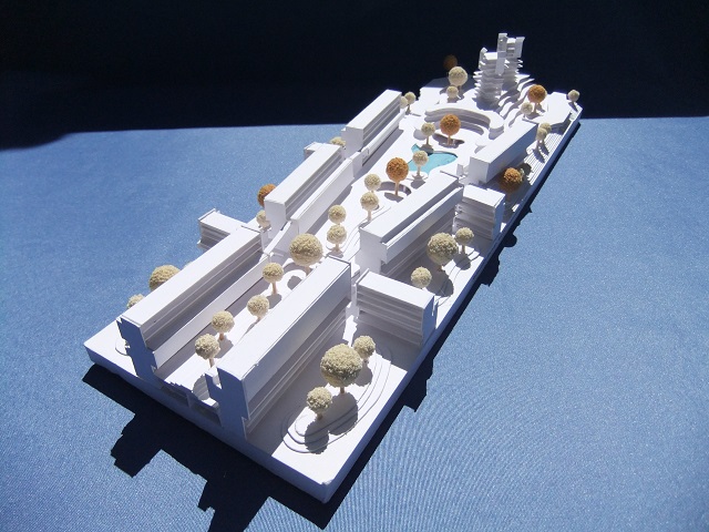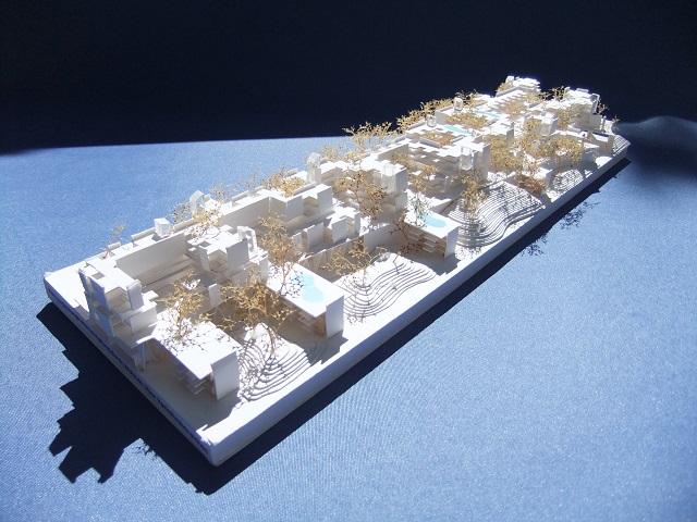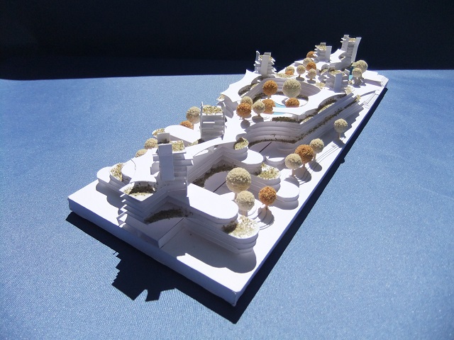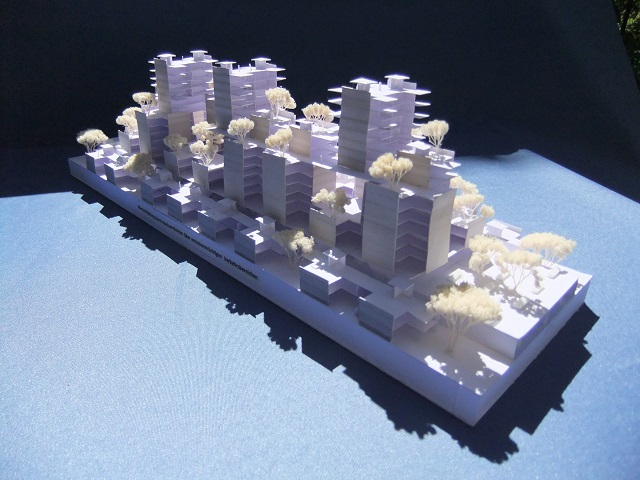 Nutzung von emissionsträchtigen Straßen und Plätzen durch eine modulare, begrünte Überbauung. Verbindung von Verkehr getrennter Stadtviertel und Schaffung eines guten Mikroklimas. Stellplätze befinden sich unter der Bodenplatte der Stadtlandschaft.
