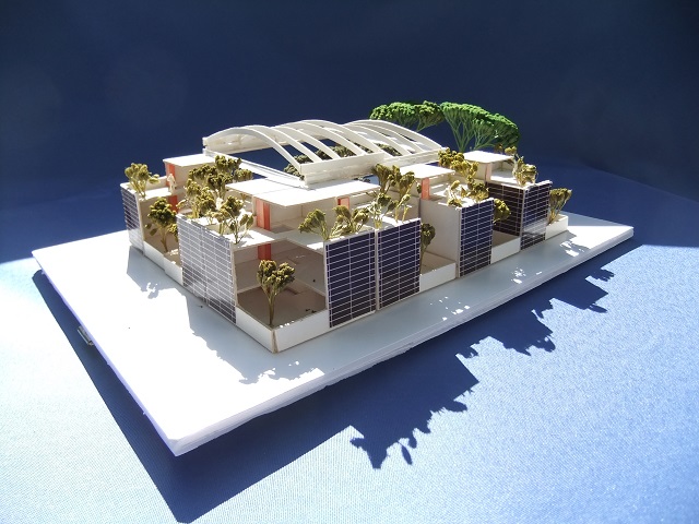Verdichtetes modulares Atriumhausensemble mit möglichen Gemeinschaftseinrichtungen im großzügigen Wintergarten und Wohnungsvielfalt von 30-160 m2 am Erschließungskern. Komprimiertes Bauen reduziert teure Grundstücks- und Herstellungskosten. Verdichtung an öffentlichen Haltestellen und Infrastruktureinrichtungen reduziert den Autoverkehr. Stellplätze werden im UG. angeboten.