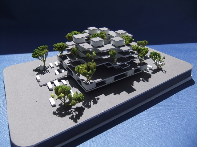 Mit rampenmäßiger Erschließung und zusätzlichen Stellplätzen über Parkplätzen und Einzelhandels Filialen werden neue aufgeständerte Baugrundstücke im nicht genutzten Luftraum geschaffen. Gassenartige Erschließung über Innenhöfe schafft einen intimen Dorfcharakter.