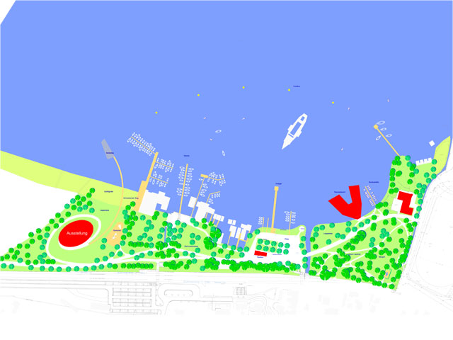 - Am Schiffsanlegeplatz führt eine wellenartige Holzrampen-Anlage auf das höher gelegte Plateau mit dem denkmalgeschützten Ausstellungspavillon. Diese Holzflächen dienen als Sitz- oder Liegemöglichkeit.