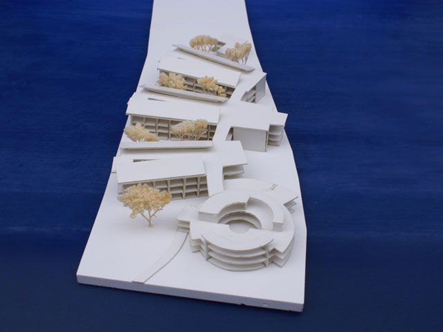 Holzdachkonstruktionen z.T. raumhaltig mit Blechdeckung. Innenliegende Dächer ggf. extensiv begrünt. Sonnenschutzmarkisen in allen erforderlichen Bereichen. Unterkellerungen nur im notwendigen Maß in wasserundurchlässiger Bauweise. Putzfassaden mit Metall bzw. Holzfenstern in farbiger Abstufung zu den sonstigen Bauteilen. Markante Traufgesimsausbildung mit Übergang auf eine entsprechende Ortgang- und Firstausbildung, farbig gestaltet.